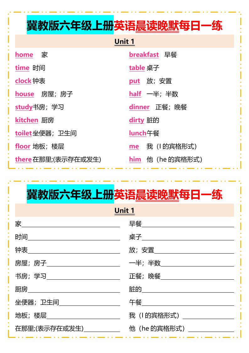 2025年秋冀教版六年级上册英语晨读晚默每日一练